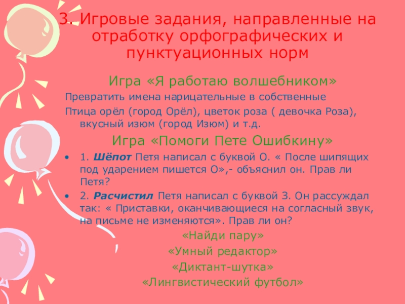 Слайд 253. Игровые задания, направленные на отработку орфографических и пунктуационных норм