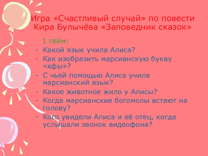 Слайд 16Игра «Счастливый случай» по повести Кира Булычёва «Заповедник сказок»