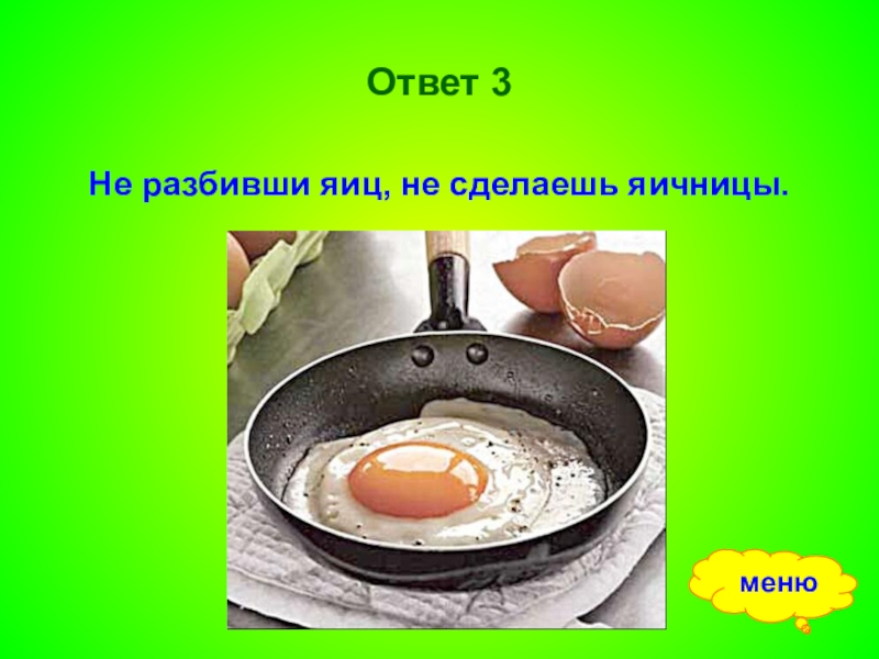 Ответ 3Не разбивши яиц, не сделаешь яичницы. меню
