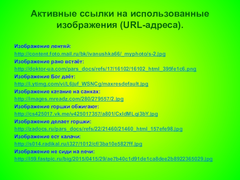 Активные ссылки на использованные изображения (URL-адреса). Изображение лентяй:http://content.foto.mail.ru/bk/ivanushka66/_myphoto/s-2.jpgИзображение рано встаёт:http://doktor-ua.com/pars_docs/refs/17/16102/16102_html_395fe1c6.pngИзображение Бог даёт:http://i.ytimg.com/vi/L6juf_WSNCg/maxresdefault.jpgИзображение катание на санках:http://images.mreadz.com/280/279557/2.jpgИзображение горшки