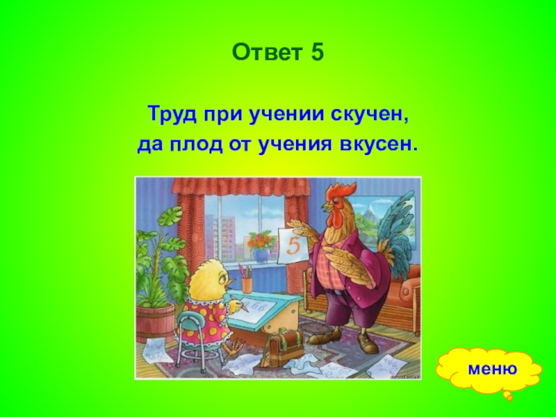 Ответ 5Труд при учении скучен, да плод от учения вкусен. меню
