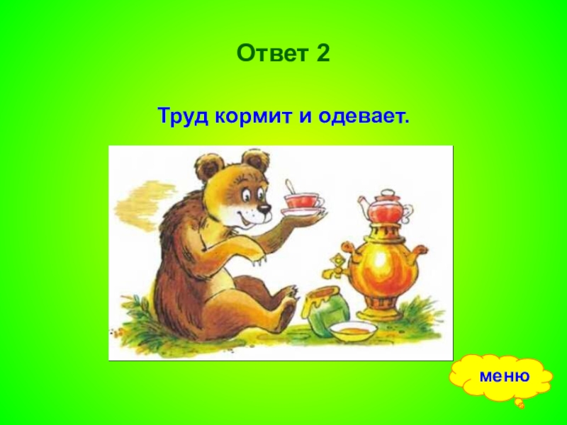 Ответ 6Землю солнце красит, а человека — труд.меню