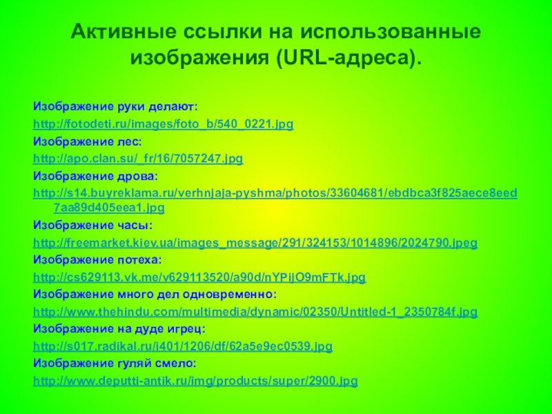 Активные ссылки на использованные изображения (URL-адреса). Изображение руки делают:http://fotodeti.ru/images/foto_b/540_0221.jpgИзображение лес:http://apo.clan.su/_fr/16/7057247.jpgИзображение дрова:http://s14.buyreklama.ru/verhnjaja-pyshma/photos/33604681/ebdbca3f825aece8eed7aa89d405eea1.jpgИзображение часы:http://freemarket.kiev.ua/images_message/291/324153/1014896/2024790.jpegИзображение потеха:http://cs629113.vk.me/v629113520/a90d/nYPijO9mFTk.jpgИзображение много дел одновременно:http://www.thehindu.com/multimedia/dynamic/02350/Untitled-1_2350784f.jpgИзображение