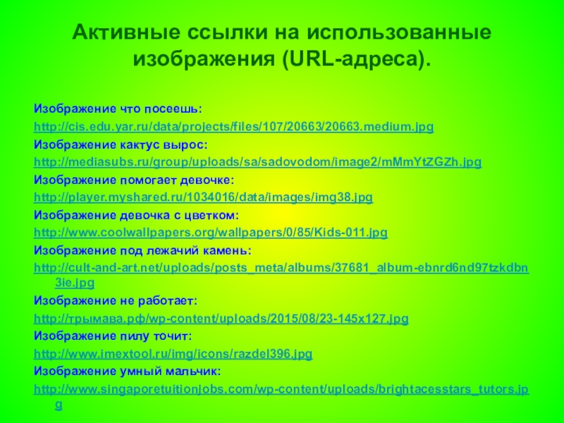 Активные ссылки на использованные изображения (URL-адреса). Изображение что посеешь:http://cis.edu.yar.ru/data/projects/files/107/20663/20663.medium.jpgИзображение кактус вырос:http://mediasubs.ru/group/uploads/sa/sadovodom/image2/mMmYtZGZh.jpgИзображение помогает девочке:http://player.myshared.ru/1034016/data/images/img38.jpgИзображение девочка с цветком:http://www.coolwallpapers.org/wallpapers/0/85/Kids-011.jpgИзображение