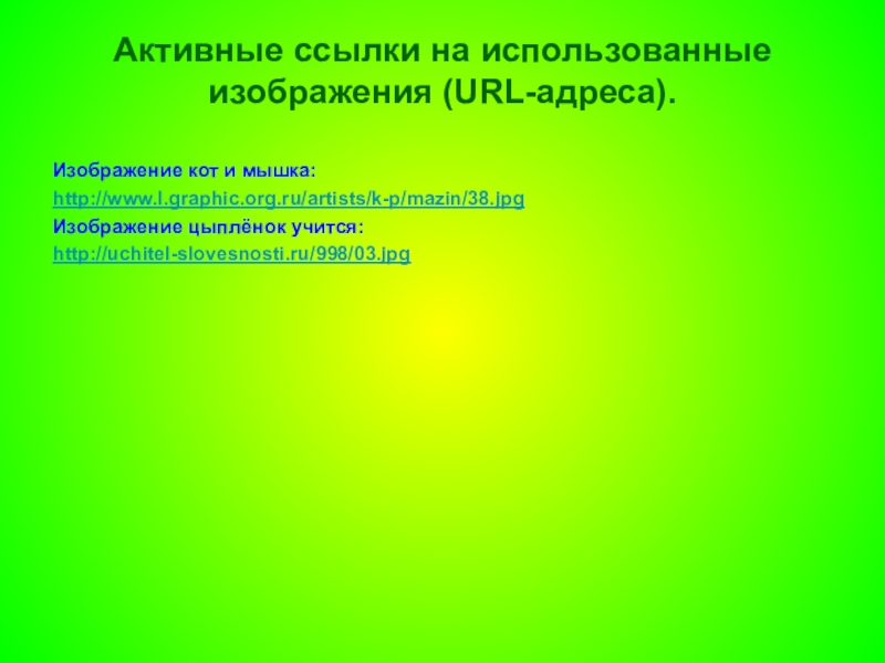 Активные ссылки на использованные изображения (URL-адреса). Изображение кот и мышка:http://www.l.graphic.org.ru/artists/k-p/mazin/38.jpgИзображение цыплёнок учится:http://uchitel-slovesnosti.ru/998/03.jpg