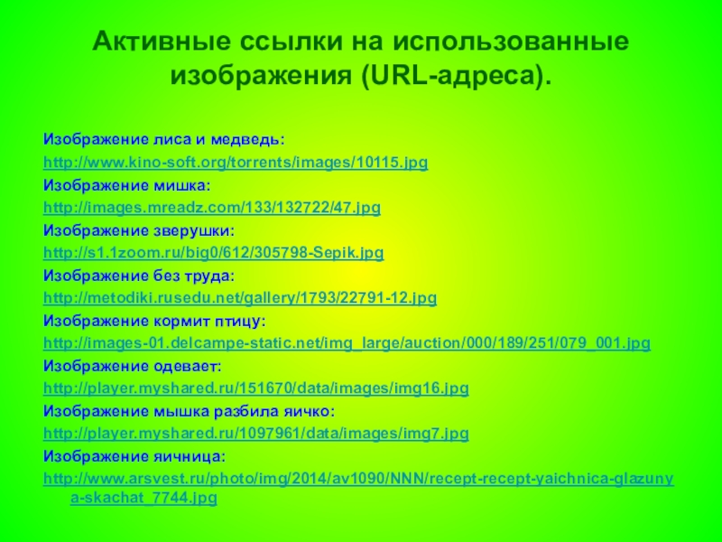 Активные ссылки на использованные изображения (URL-адреса). Изображение лиса и медведь:http://www.kino-soft.org/torrents/images/10115.jpgИзображение мишка:http://images.mreadz.com/133/132722/47.jpgИзображение зверушки:http://s1.1zoom.ru/big0/612/305798-Sepik.jpgИзображение без труда:http://metodiki.rusedu.net/gallery/1793/22791-12.jpgИзображение кормит птицу:http://images-01.delcampe-static.net/img_large/auction/000/189/251/079_001.jpgИзображение