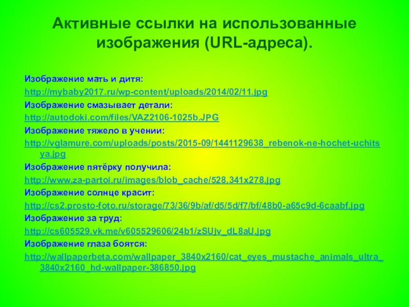 Активные ссылки на использованные изображения (URL-адреса). Изображение мать и дитя:http://mybaby2017.ru/wp-content/uploads/2014/02/11.jpgИзображение смазывает детали:http://autodoki.com/files/VAZ2106-1025b.JPGИзображение тяжело в учении:http://vglamure.com/uploads/posts/2015-09/1441129638_rebenok-ne-hochet-uchitsya.jpgИзображение пятёрку