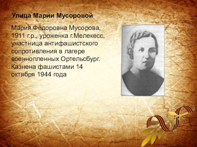Мария Фёдоровна Мусорова, 1911 г.р., уроженка г.Мелекесс, участница антифашистского