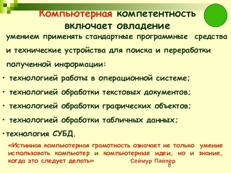 «Истинная компьютерная грамотность означает не только умение использовать компьютер и компьютерные идеи, но и знание, когда это следует делать» Сеймур Пайпер