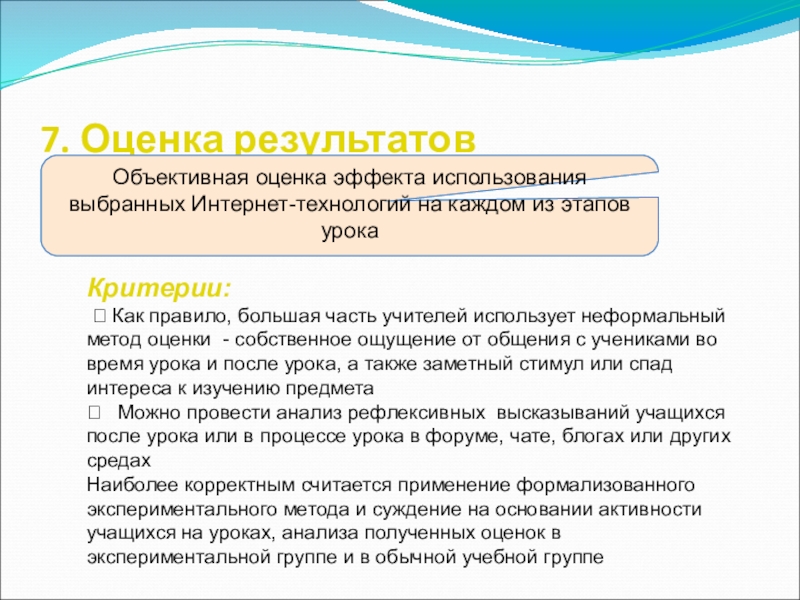 Наиболее корректным считается применение формализованного экспериментального метода и суждение на основании активности учащихся на уроках, анализа полученных оценок в экспериментальной группе и в обычной учебной группе