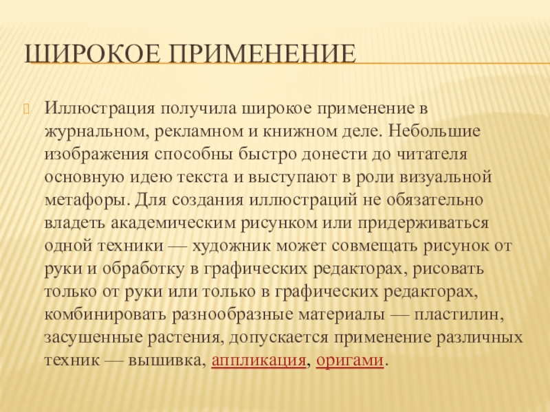 Иллюстрация получила широкое применение в журнальном, рекламном и книжном деле.