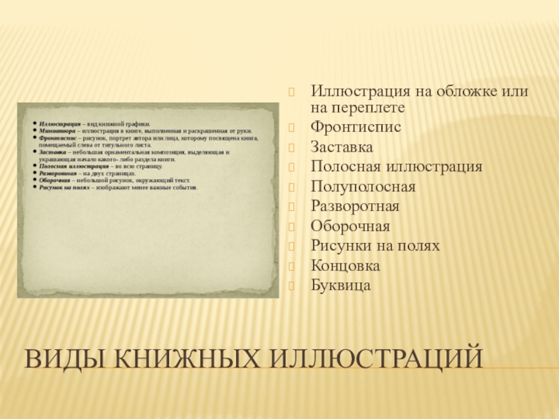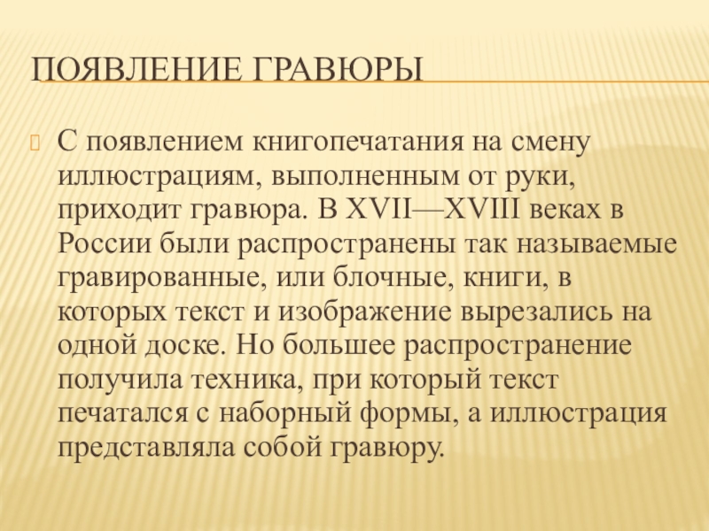 гравюра. В XVII—XVIII веках в России были распространены так называемые гравированные, или блочные, книги, в которых текст и изображение вырезались на одной доске. Но большее распространение получила техника, при который текст печатался с наборный формы, а иллюстрация представляла собой гравюру.