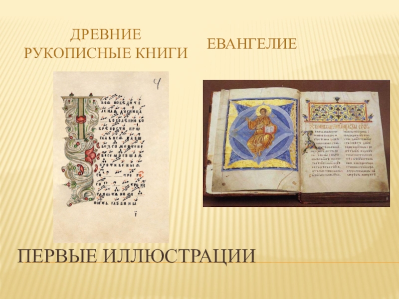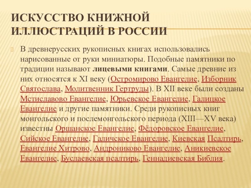 руки миниатюры. Подобные памятники по традиции называют лицевыми книгами. Самые древние из них относятся к XI веку (Остромирово Евангелие, Изборник Святослава, Молитвенник Гертруды). В XII веке были созданы Мстиславово Евангелие, Юрьевское Евангелие, Галицкое Евангелие и другие памятники. Среди рукописных книг монгольского и послемонгольского периода (XIII—XV века) известны Оршанское Евангелие, Фёдоровское Евангелие, Сийское Евангелие, Галичское Евангелие, Киевская Псалтирь, Евангелие Хитрово, Андрониково Евангелие, Аникиевское Евангелие, Буслаевская псалтирь, Геннадиевская Библия.