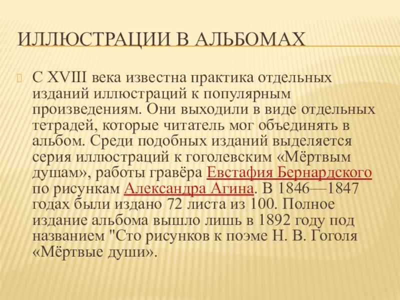 популярным произведениям. Они выходили в виде отдельных тетрадей, которые читатель мог объединять в альбом. Среди подобных изданий выделяется серия иллюстраций к гоголевским «Мёртвым душам», работы гравёра Евстафия Бернардского по рисункам Александра Агина. В 1846—1847 годах были издано 72 листа из 100. Полное издание альбома вышло лишь в 1892 году под названием "Сто рисунков к поэме Н. В. Гоголя «Мёртвые души».
