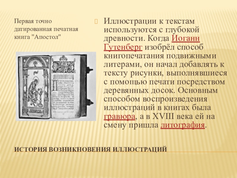 используются с глубокой древности. Когда Иоганн Гутенберг изобрёл способ книгопечатания подвижными литерами, он начал добавлять к тексту рисунки, выполнявшиеся с помощью печати посредством деревянных досок. Основным способом воспроизведения иллюстраций в книгах была гравюра, а в XVIII века ей на смену пришла литография.