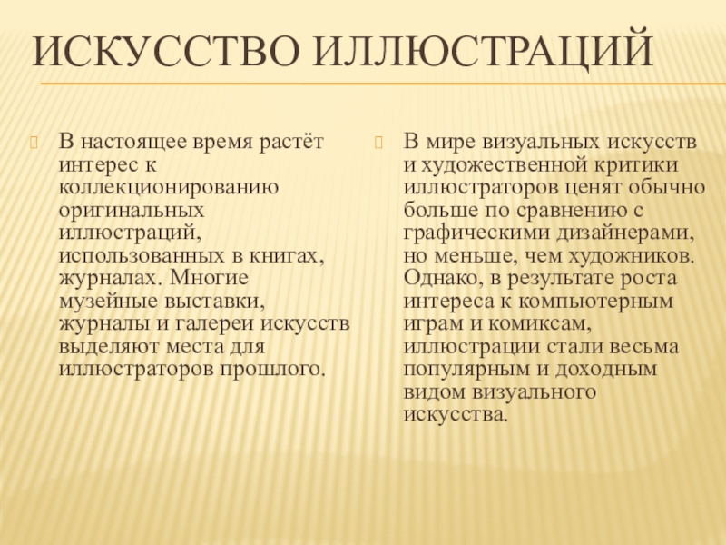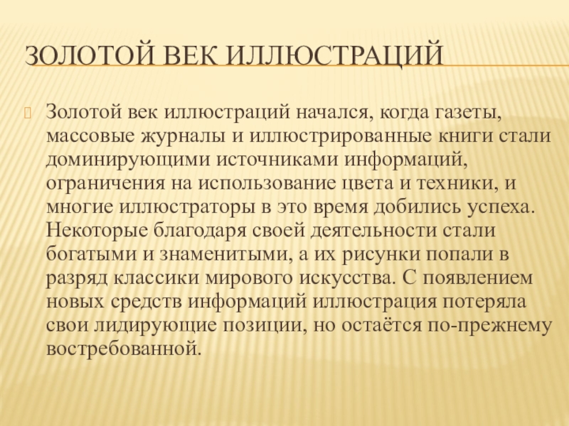 иллюстрированные книги стали доминирующими источниками информаций, ограничения на использование цвета и техники, и многие иллюстраторы в это время добились успеха. Некоторые благодаря своей деятельности стали богатыми и знаменитыми, а их рисунки попали в разряд классики мирового искусства. С появлением новых средств информаций иллюстрация потеряла свои лидирующие позиции, но остаётся по-прежнему востребованной.