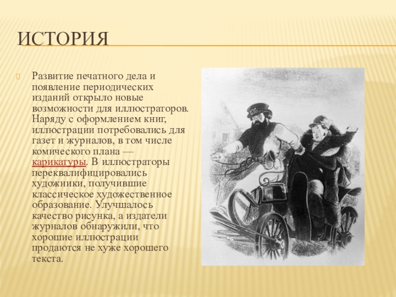 иллюстраторов. Наряду с оформлением книг, иллюстрации потребовались для газет и журналов, в том числе комического плана — карикатуры. В иллюстраторы переквалифицировались художники, получившие классическое художественное образование. Улучшалось качество рисунка, а издатели журналов обнаружили, что хорошие иллюстрации продаются не хуже хорошего текста.