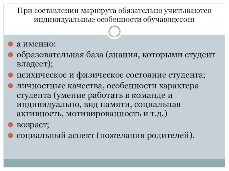 Слайд 16При составлении маршрута обязательно учитываются индивидуальные особенности обучающегося