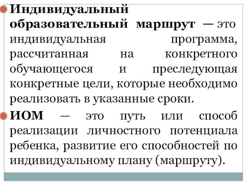 ИОМ — это путь или способ реализации личностного потенциала ребенка, развитие его способностей по индивидуальному плану (маршруту).