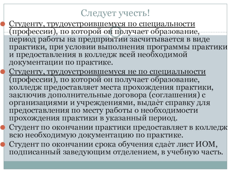 Студенту, трудоустроившемуся не по специальности (профессии), по которой он получает образование, колледж предоставляет места прохождения практики, заключив дополнительные договора (соглашения) с организациями и учреждениями, выдаѐт справку для предоставления по месту работы о необходимости прохождения практики в указанный период.