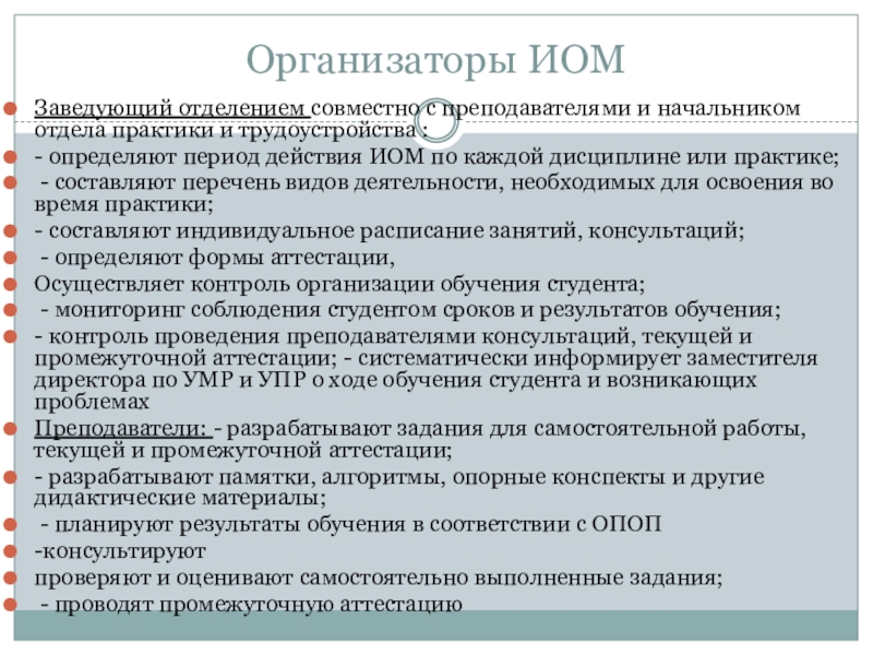 - директор издает приказ на основании решения комиссии; - заведующий учебной частью выдает студенту лист ИОМ, в который участниками организации обучения по ИОМ вносятся следующие сведения: