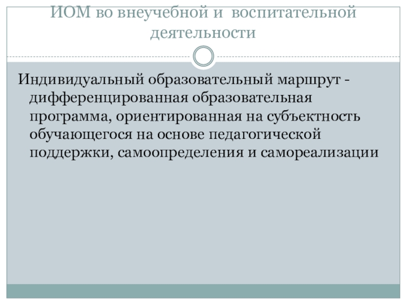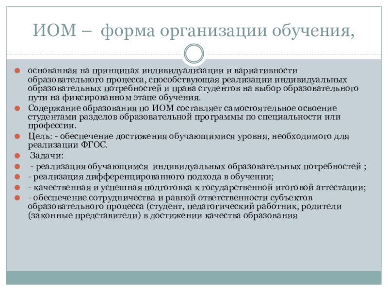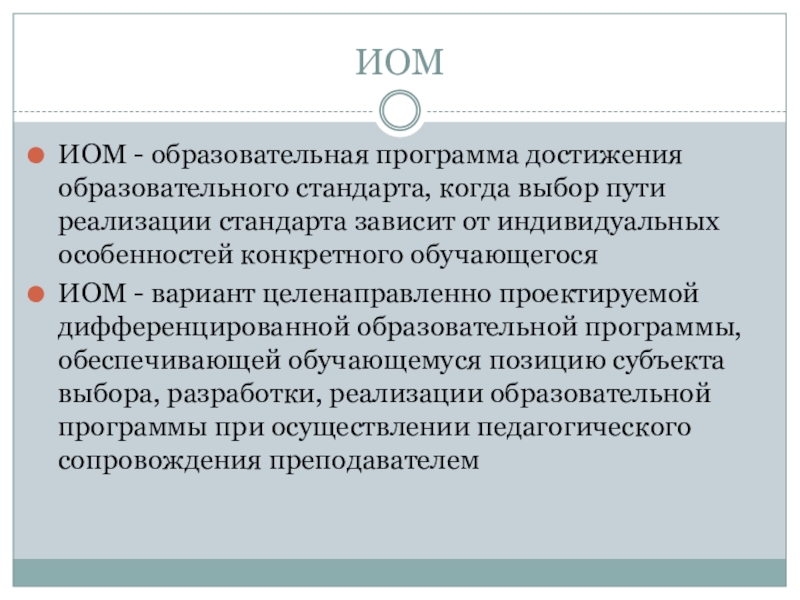 ИОМ - вариант целенаправленно проектируемой дифференцированной образовательной программы, обеспечивающей обучающемуся позицию субъекта выбора, разработки, реализации образовательной программы при осуществлении педагогического сопровождения преподавателем