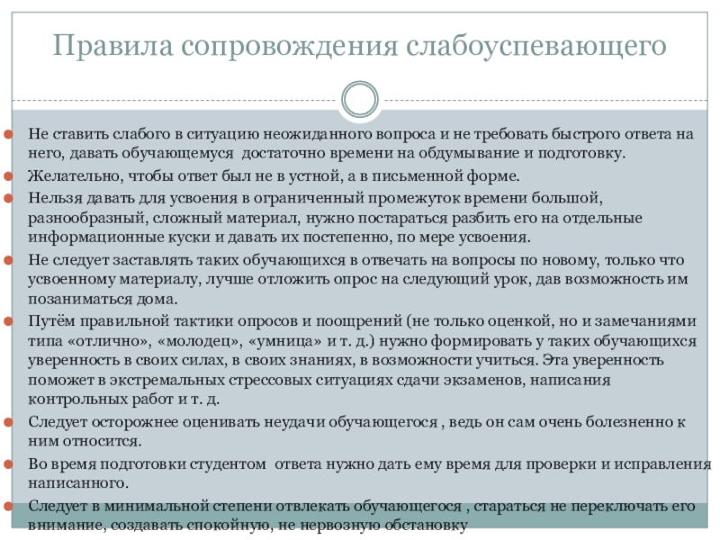 Слайд 35Правила сопровождения слабоуспевающего