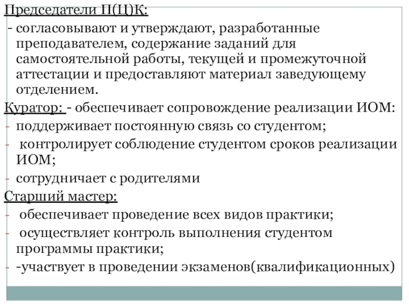 - контроль проведения преподавателями консультаций, текущей и промежуточной аттестации; - систематически информирует заместителя директора по УМР и УПР о ходе обучения студента и возникающих проблемах