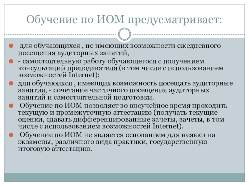 Обучение по ИОМ не является основанием для неявки на экзамены, различного вида практики, государственную итоговую аттестацию.