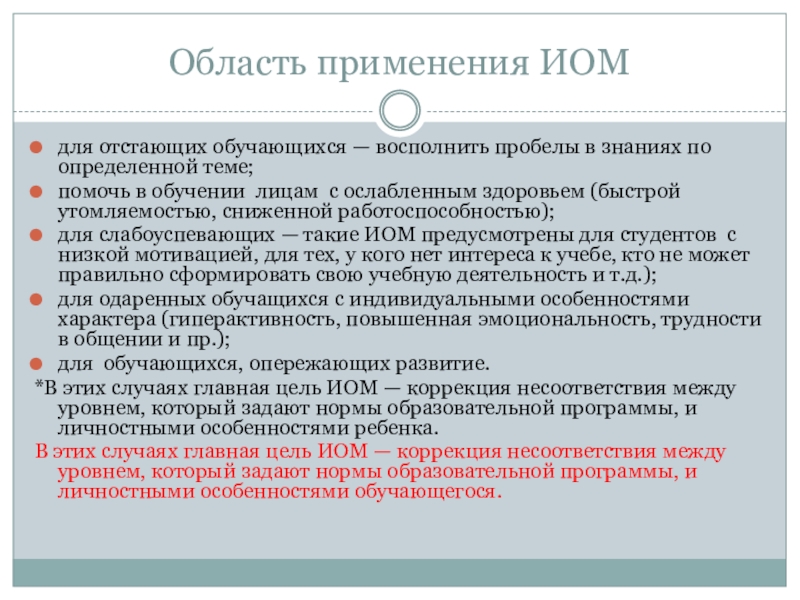 В этих случаях главная цель ИОМ — коррекция несоответствия между уровнем, который задают нормы образовательной программы, и личностными особенностями обучающегося.