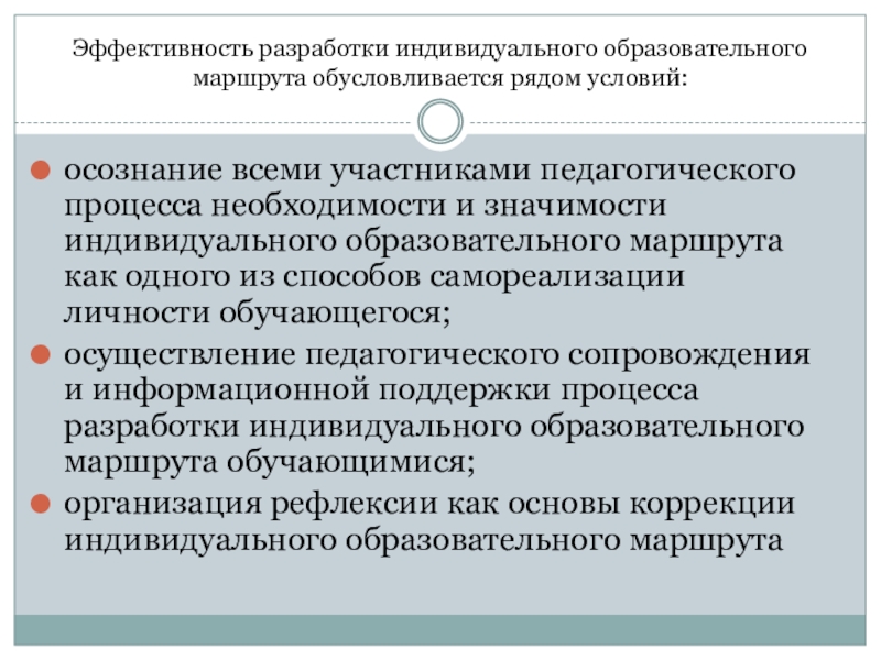 Слайд 18Эффективность разработки индивидуального образовательного маршрута обусловливается рядом условий: