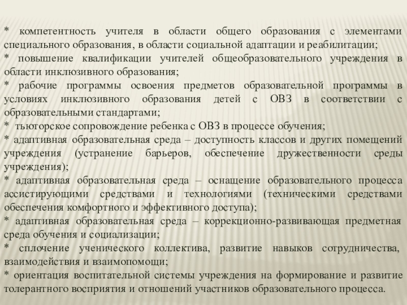 Слайд 9* компетентность учителя в области общего образования с элементами специального образования,