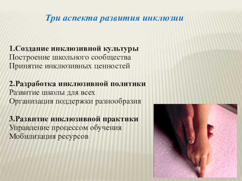 Слайд 5Три аспекта развития инклюзии