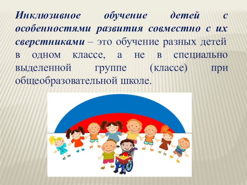 Слайд 3Инклюзивное обучение детей с особенностями развития совместно с их сверстниками – это