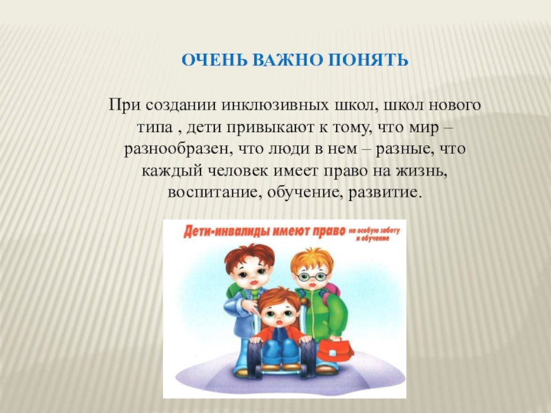 привыкают к тому, что мир – разнообразен, что люди в нем – разные, что каждый человек имеет право на жизнь, воспитание, обучение, развитие.