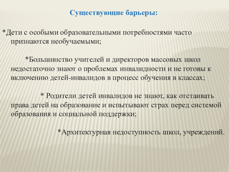 *Большинство учителей и директоров массовых школ недостаточно знают о проблемах инвалидности и не готовы к включению детей-инвалидов в процесс обучения в классах;