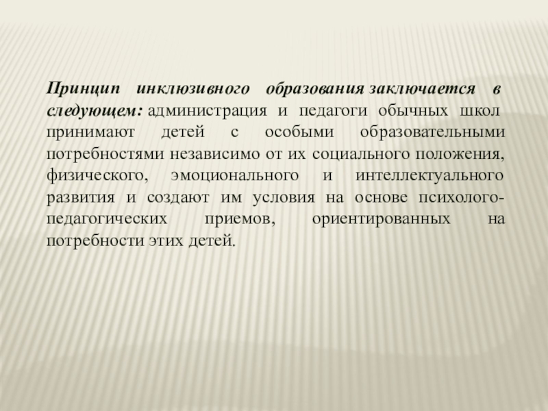 Слайд 7Принцип инклюзивного образования заключается в следующем: администрация и педагоги обычных школ принимают детей