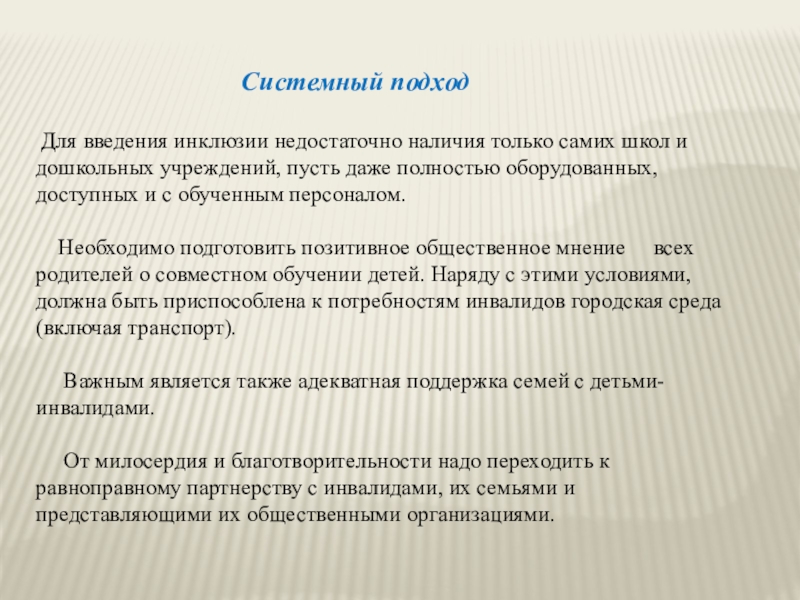 Слайд 13 Для введения инклюзии недостаточно наличия только самих школ и дошкольных