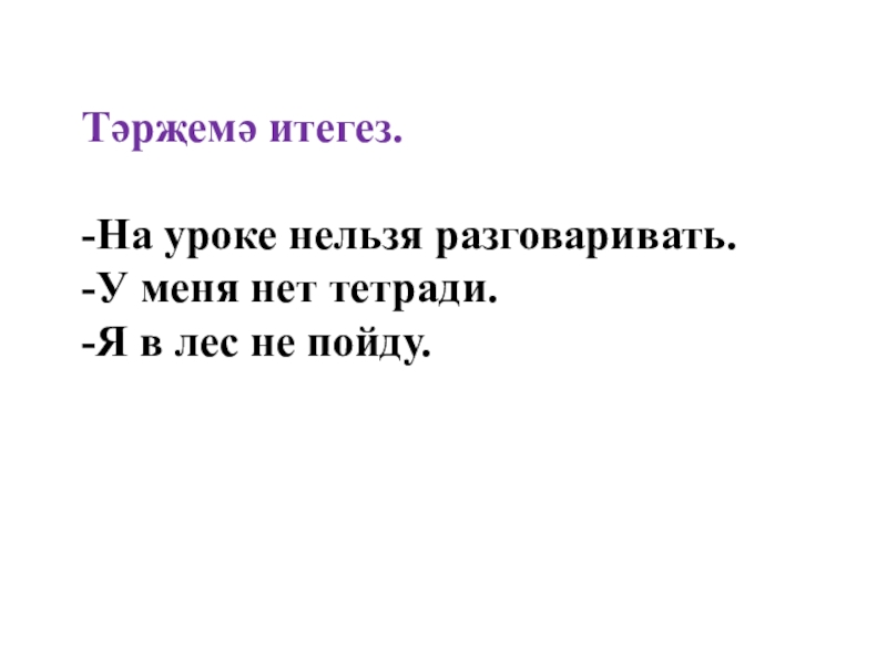 Тәрҗемә итегез.  -На уроке нельзя разговаривать. -У меня нет тетради. -Я в лес не пойду.