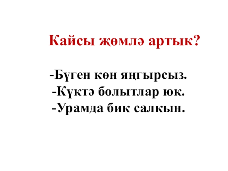 Слайд 9 Кайсы җөмлә артык? -Бүген көн яңгырсыз.