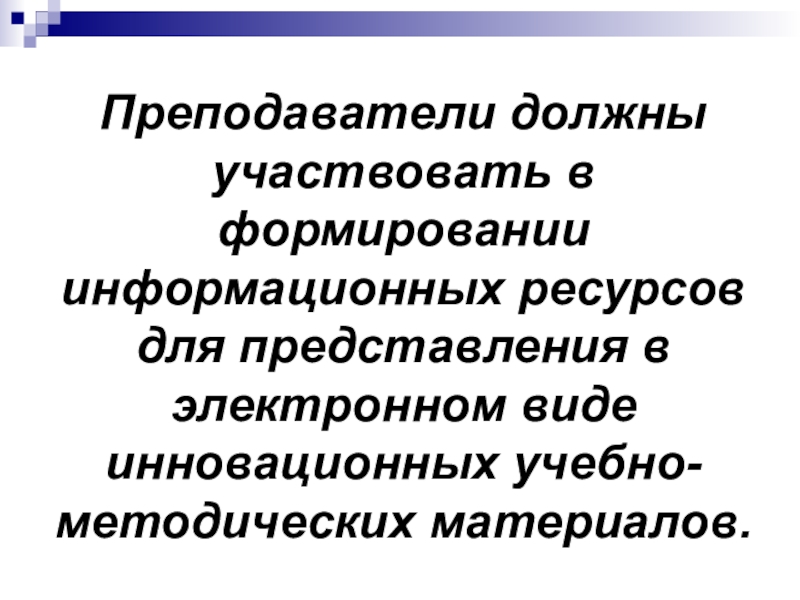Слайд 23Преподаватели должны участвовать в формировании информационных ресурсов для представления в электронном