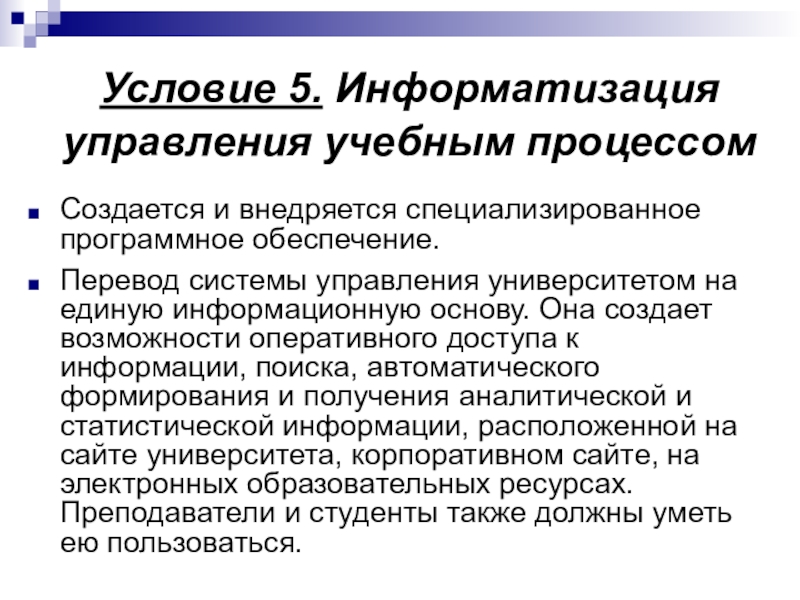 Слайд 21Условие 5. Информатизация управления учебным процессом