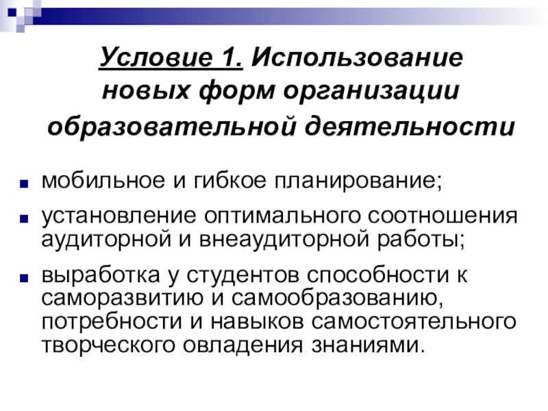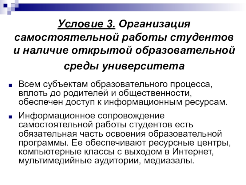 Слайд 19Условие 3. Организация самостоятельной работы студентов и наличие открытой образовательной среды