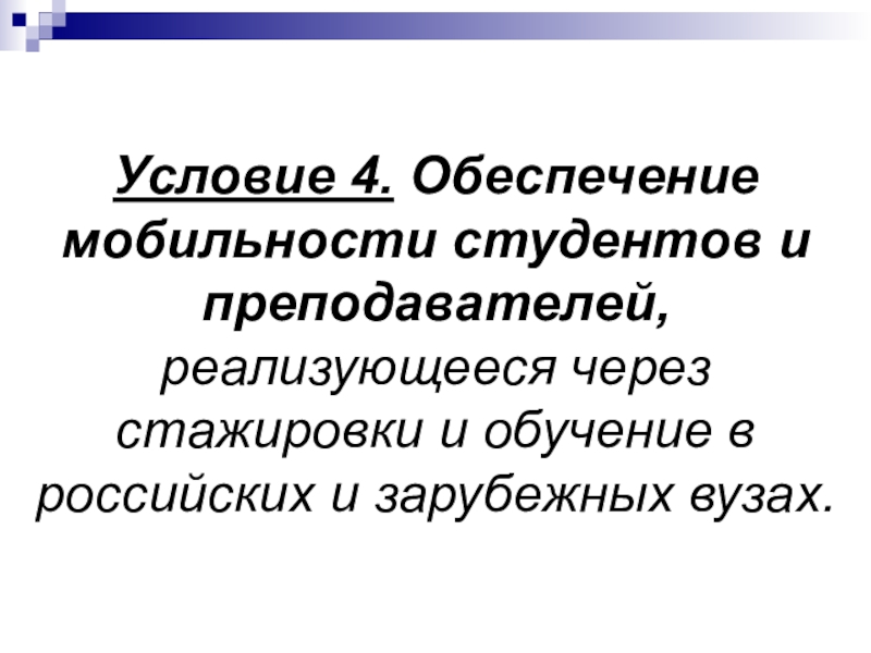 Слайд 20Условие 4. Обеспечение мобильности студентов и преподавателей, реализующееся через стажировки и