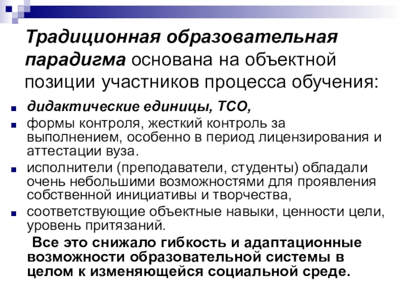 Слайд 11Традиционная образовательная парадигма основана на объектной позиции участников процесса обучения: