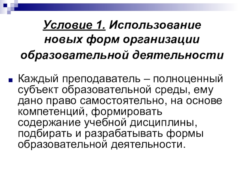 полноценный субъект образовательной среды, ему дано право самостоятельно, на основе компетенций, формировать содержание учебной дисциплины, подбирать и разрабатывать формы образовательной деятельности.