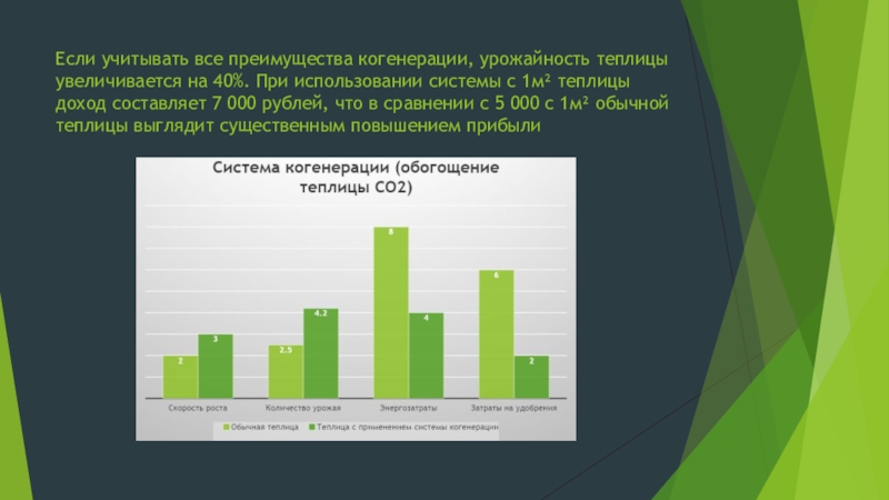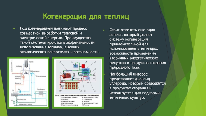 Стоит отметить еще один аспект, который делает систему когенерации привлекательной для использования в теплицах: возможность применения вторичных энергетических ресурсов и продуктов сгорания природного газа.