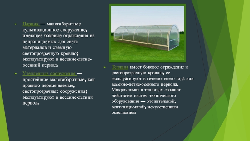 Теплица имеет боковое ограждение и светопрозрачную кровлю, ее эксплуатируют в течение всего года или весенне-летне-осеннего периода. Микроклимат в теплицах создают действием систем технического оборудования — отопительной, вентиляционной, искусственным освещением