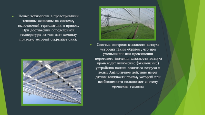 Система контроля влажности воздуха устроена таким образом, что при уменьшении или превышении порогового значения влажности воздуха происходит включение (отключение) устройства подачи влажного воздуха и воды. Аналогичное действие имеет датчик влажности почвы, который при необходимости подключает систему орошения теплицы