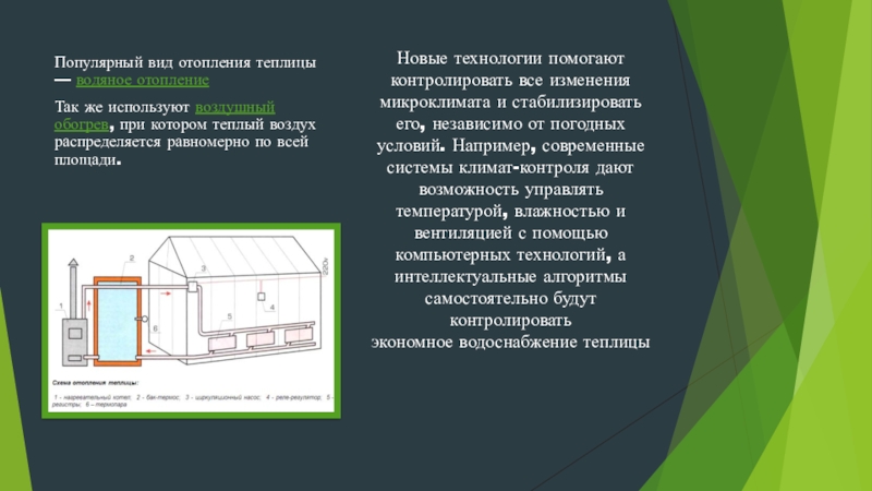 Так же используют воздушный обогрев, при котором теплый воздух распределяется равномерно по всей площади.